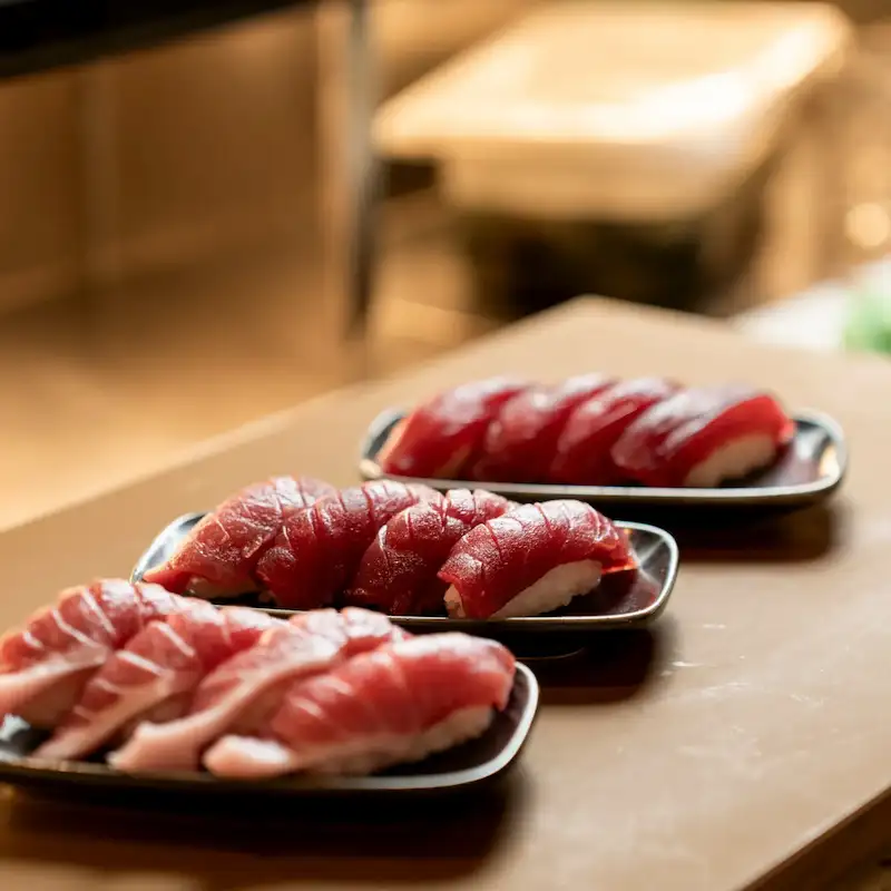 Salmone*, gambero* cotto e avocado all’interno, con tartare di gambero* rosso mediterraneo, accompagnato da maionese al peperoncino, salsa teriyaki e perlage di riso in stile giapponese